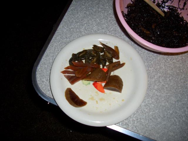 そんな訳で大事な食材のほとんどをカラスに持って行かれたので、夕食は難を逃れたカレーと山芋と冷凍の焼き鳥に猪鍋用に買いに行った材料(ごぼう、大根、ねぎ、豆腐)で作った味噌汁。 みかねた管理人さんがハンバーグとひじきの炒め物と漬物を差し入れてくれました。ひじきは普段家で食べてる物より歯ごたえがあり味付けもバッチリでとても旨かった。