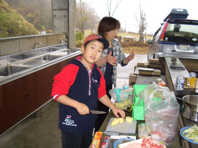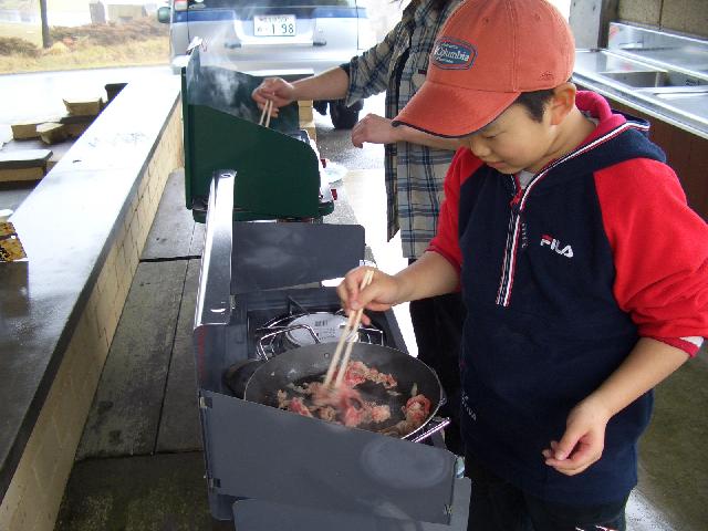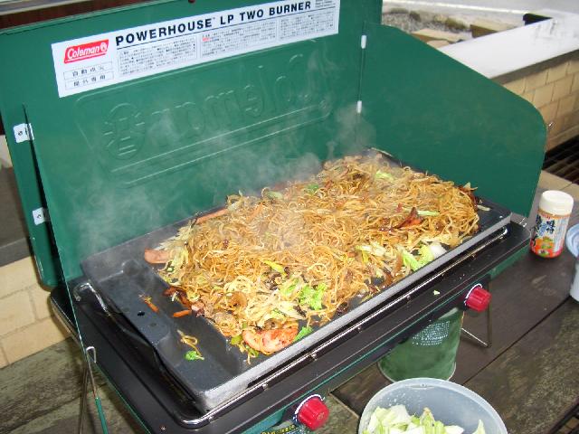 雨の中、炊事棟の中で昼食のソース焼きそば(母さん担当)と夕食のカレー(慶一朗担当)の仕込みの準備中。(ちなみに父さんはビールを飲みながら撮影と味見&試食担当)焼きそばは少し焦がすのがポイント!パリパリの食感がGOO! さてこの後大変な事態が起こるとも知らず3人は焼きそばを頬張るのでした。・・・・