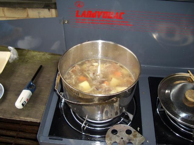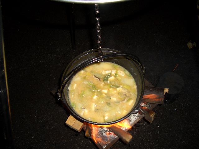 普通なら夜はバーベキューだけど、寒かったのと猪の肉が手に入ったので「猪鍋だぁ〜」とはりきったものの猪肉をカラスに持って行かれ、ただの味噌汁に・・・・・。でも冷えた体が温まりました。