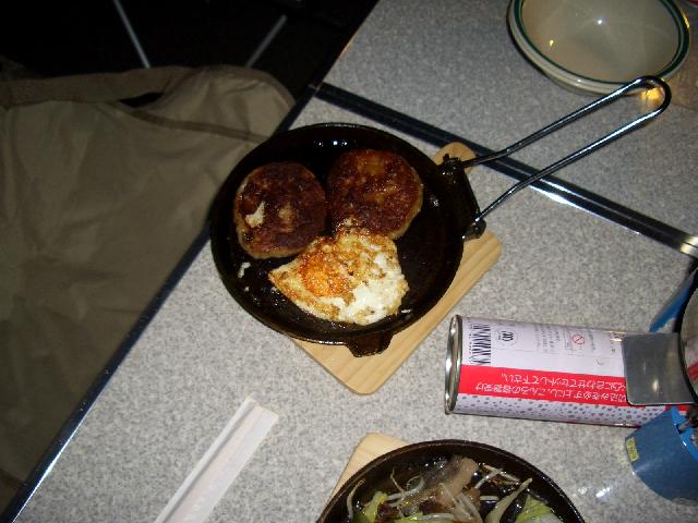鍋は長ネギ・椎茸・白菜・ごぼう・にんじんのたっぷりの野菜を入れ味噌仕立てに、焼肉は長ネギともやしと椎茸で炒め塩コショウで味をつけたもの。肉は炒めると大量の油がでました。 あと家から持ってきた冷凍の豚肉のハンバーグ、100スキで両面を焼いて出来上がり!